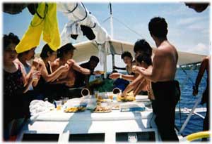 1本目が終わり波のないところでの昼食. パン,サラダ(キャベツ,キュウリ,トマト,コンビーフ,ツナ),紅茶,コーヒ デザートはバナナ,マンゴ
