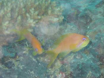 珊瑚の上には小さなキンギョハナダイがたくさんいました。 |